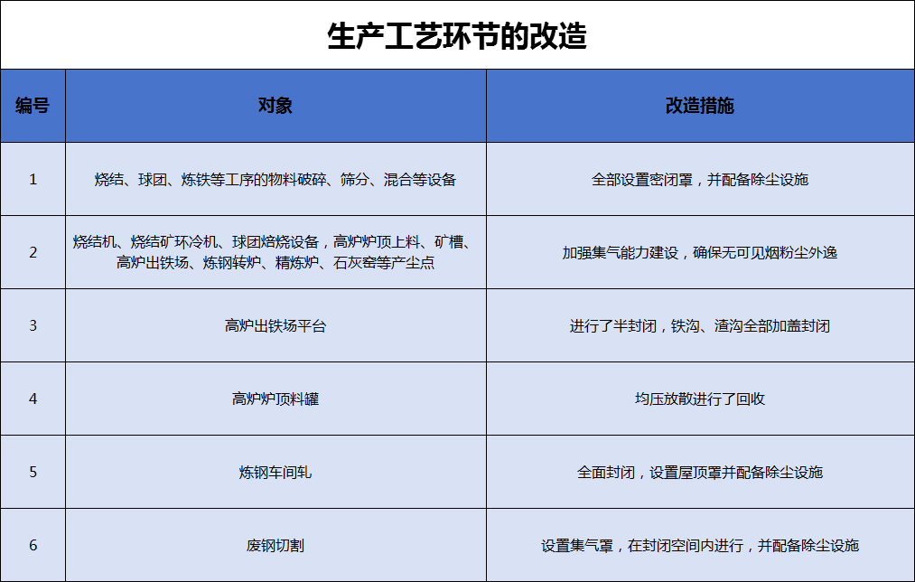長強(qiáng)鋼鐵對于燒結(jié)機(jī)、燒結(jié)礦環(huán)冷機(jī)、高爐爐頂上料、高爐礦槽、高爐出鐵場、轉(zhuǎn)爐、精煉爐等產(chǎn)塵點(diǎn)已全面加強(qiáng)集氣能力建設(shè),配備了除塵設(shè)施。高爐出鐵場平臺已經(jīng)進(jìn)行了封閉改造,鐵溝、渣溝加蓋封閉:高爐爐頂料罐均壓放散廢氣均進(jìn)行回收處理。煉鋼車間封閉,配備了屋頂三次除塵罩。廢鋼切割在封閉的空間內(nèi)進(jìn)行,設(shè)置了集氣罩,并配備了除塵設(shè)施。生產(chǎn)工藝過程控制措施滿足意見中相關(guān)的要求。