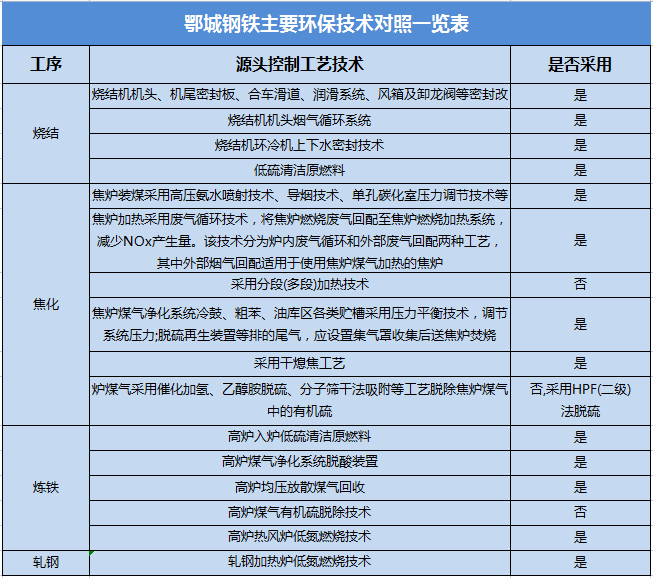 鄂城鋼鐵已實(shí)現(xiàn)原料系統(tǒng)機(jī)械化全封閉料場,廠內(nèi)全封閉皮帶通廊料;燒結(jié)機(jī)機(jī)頭煙氣采用靜電除塵器+SDA脫硫+SCR脫硝;高爐礦槽、出鐵采用覆膜濾料除塵器;焦?fàn)t煙氣采用碳基催化氧化脫硫+SCR脫硝,裝煤、推焦干熄焦均采用覆膜濾料除塵器;轉(zhuǎn)爐一次煙氣采用LT干法靜電除塵,轉(zhuǎn)爐二煙氣采用覆膜濾料除塵器,并建有屋頂三次除塵系統(tǒng),以控制煉鋼車間無組織放;軋鋼熱處理爐均實(shí)施低氮燃燒/煙氣循環(huán)改造,完成實(shí)現(xiàn)超低排放達(dá)標(biāo)。