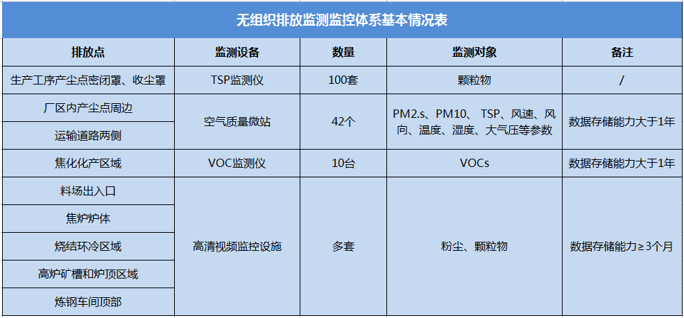 鄂城鋼鐵在全廠無組織排放控制區(qū)域布置了100套TSP揚(yáng)塵監(jiān)測儀、42個(gè)空氣質(zhì)量微站,10臺(tái)VOC監(jiān)測儀及高清視頻監(jiān)控設(shè)施等網(wǎng)格化監(jiān)測系統(tǒng),在線實(shí)時(shí)監(jiān)測所有無組織排放情況,各車間控制室可直接進(jìn)行查看無組織排放情況,且部分生產(chǎn)環(huán)節(jié)已統(tǒng)一接入無組織管控平臺(tái)。