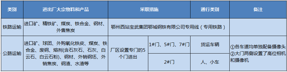 鄂城鋼鐵進(jìn)出廠區(qū)的大宗物料和產(chǎn)品主要采用鐵路運(yùn)輸、汽車運(yùn)輸。鐵路運(yùn)輸由專用鐵路承擔(dān),進(jìn)出廠大宗物料和產(chǎn)品,包括進(jìn)口礦、精鐵礦、煤炭、鐵合金、鋼材、外售焦炭等;大宗物料及產(chǎn)品汽車運(yùn)輸通過廠區(qū)專門的門進(jìn)出廠,進(jìn)出廠大宗物料和產(chǎn)品包括進(jìn)口礦、球團(tuán)、外購氧化鐵皮、煤炭、鐵合金、廢鋼、熔劑(含石灰石、石灰、白云石、白云石粉)、鋼材、外銷鋼坯、外銷焦炭、鋼渣、水渣等。