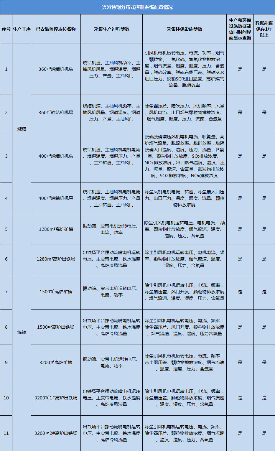 興澄特鋼按照《意見(jiàn)》要求,在燒結(jié)機(jī)機(jī)頭、燒結(jié)機(jī)機(jī)尾、高爐礦槽、高爐出鐵場(chǎng)、鐵水預(yù)處理、轉(zhuǎn)爐二次煙氣、電爐煙氣、自備電站排氣筒等生產(chǎn)設(shè)施和污染源治理設(shè)施上安裝DCS或具備其功能的分布式控制系統(tǒng),記錄企業(yè)環(huán)保設(shè)施運(yùn)行及相關(guān)生產(chǎn)過(guò)程主要參數(shù),實(shí)時(shí)掌握生產(chǎn)設(shè)備和環(huán)保設(shè)施的運(yùn)行情況、污染治理及排放情況、污染源停限產(chǎn)及錯(cuò)峰生產(chǎn)情況等信息,并接入超低排放一體化平臺(tái),平臺(tái)可直接查詢各除塵、脫硫、脫硝設(shè)施運(yùn)行參數(shù),方便企業(yè)隨時(shí)管控。