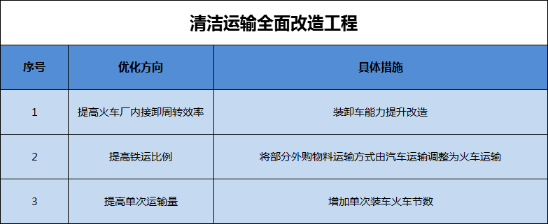 主要包括裝卸車能力提升改造,提高火車廠內(nèi)接卸周轉(zhuǎn)效率;提高鐵運(yùn)比例,將部分外購(gòu)物料運(yùn)輸方式由汽車運(yùn)輸調(diào)整為火車運(yùn)輸;增加單次裝車火車節(jié)數(shù)等。