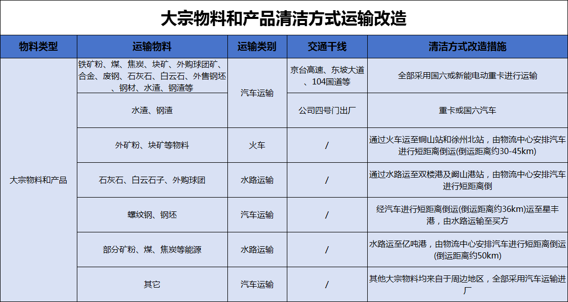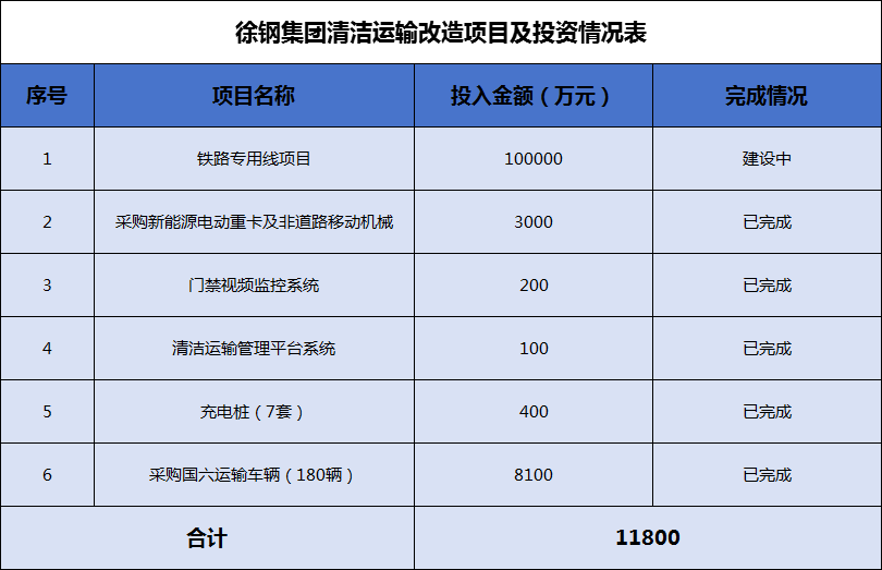 徐鋼集團(tuán)為達(dá)到超低排放要求,自2020年12月開始,投入近11.2億元開展清潔運(yùn)輸全面改造工程,主要包括:鐵路專用線改擴(kuò)建工程、采購新能源電動重卡及非道路移動機(jī)械、門禁視頻監(jiān)控系統(tǒng)、清潔運(yùn)輸管理平臺系統(tǒng)、充電樁、采購國六車輛等改造措施。