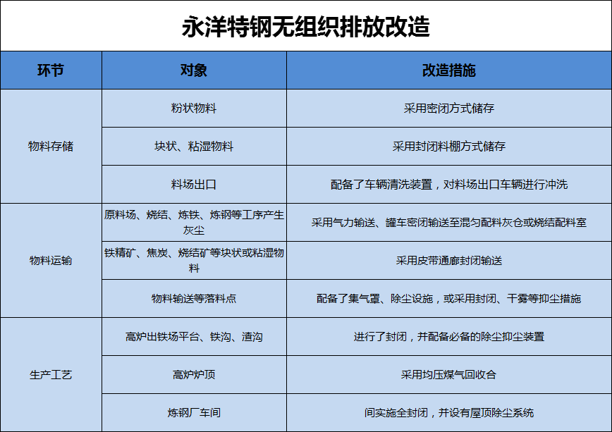 永洋特鋼與京誠嘉宇公司共同建立了工作組,對(duì)物料儲(chǔ)存、物料輸送、生產(chǎn)工藝等方面進(jìn)行了全面梳理,共梳理無組織源清單738項(xiàng),建立了全廠無組織排放清單。并針對(duì)不符合《意見》中要求的事項(xiàng)進(jìn)行6個(gè)多月的整改,完成提質(zhì)改造。
