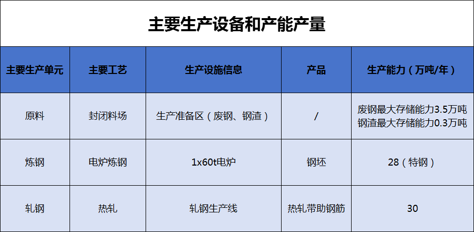 華航特鋼擁有煉鋼、軋鋼、鋼渣處理工序,煉鋼工序包括1臺(tái)60t高功率電爐(AC-EBT-60)以及配套60t精煉爐(一用一備)、連鑄機(jī)。軋鋼工序包括1條軋鋼生產(chǎn)線。鋼渣處理工序包括年產(chǎn)6萬(wàn)噸急冷風(fēng)淬系統(tǒng)。