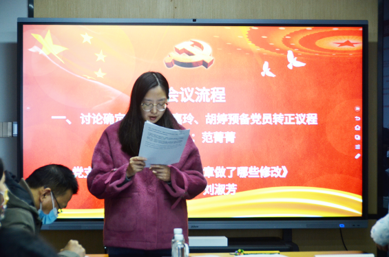 本次大會主要有兩個議程,一是討論確定張健、周嘉玲、胡婷三位預備黨員轉(zhuǎn)正;二是支部書記劉淑芳同志講黨課——《新黨章作出這些修改》。