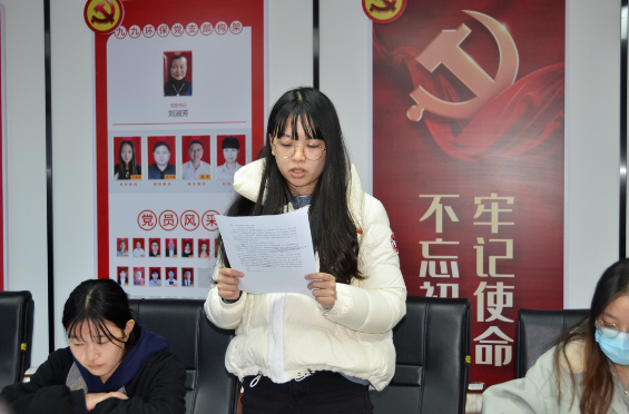 大會開始前,全體黨員起立奏唱國歌。隨后轉(zhuǎn)正會議正式開始,此次會議的主要議題是討論張健、周嘉玲、胡婷三位同志預備黨員轉(zhuǎn)正事宜。張健、周嘉玲、胡婷三位預備黨員同志分別宣讀了《轉(zhuǎn)正申請書》,匯報了自己對黨的認識及自己在一年預備期中各方面的收獲與不足之處以及今后的努力方向,表明自己轉(zhuǎn)正后的態(tài)度和決心。