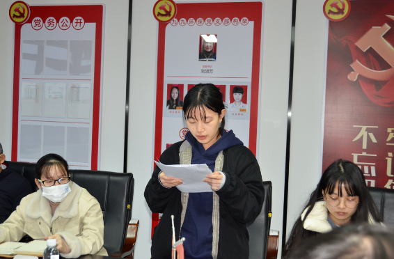 三位同志的入黨介紹人對張健、周嘉玲、胡婷三位同志在預備期中的表現(xiàn)作出評價;隨后,支部委員會黨員代表及群眾代表對張健、周嘉玲、胡婷三位同志進行評價并提出建議,希望他們緊跟時事,加強黨員的自我修養(yǎng),在工作中不斷進取,發(fā)揮黨員的榜樣作用。