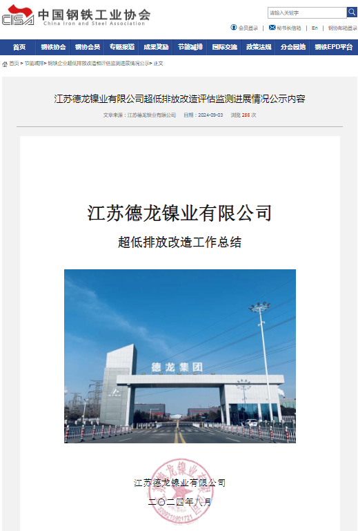 9月3日,中國鋼鐵工業(yè)協(xié)會官網(wǎng)正式公示了江蘇德龍鎳業(yè)有限公司(以下簡稱“德龍鎳業(yè)”)全流程超低排放改造評估監(jiān)測進(jìn)展情況。
