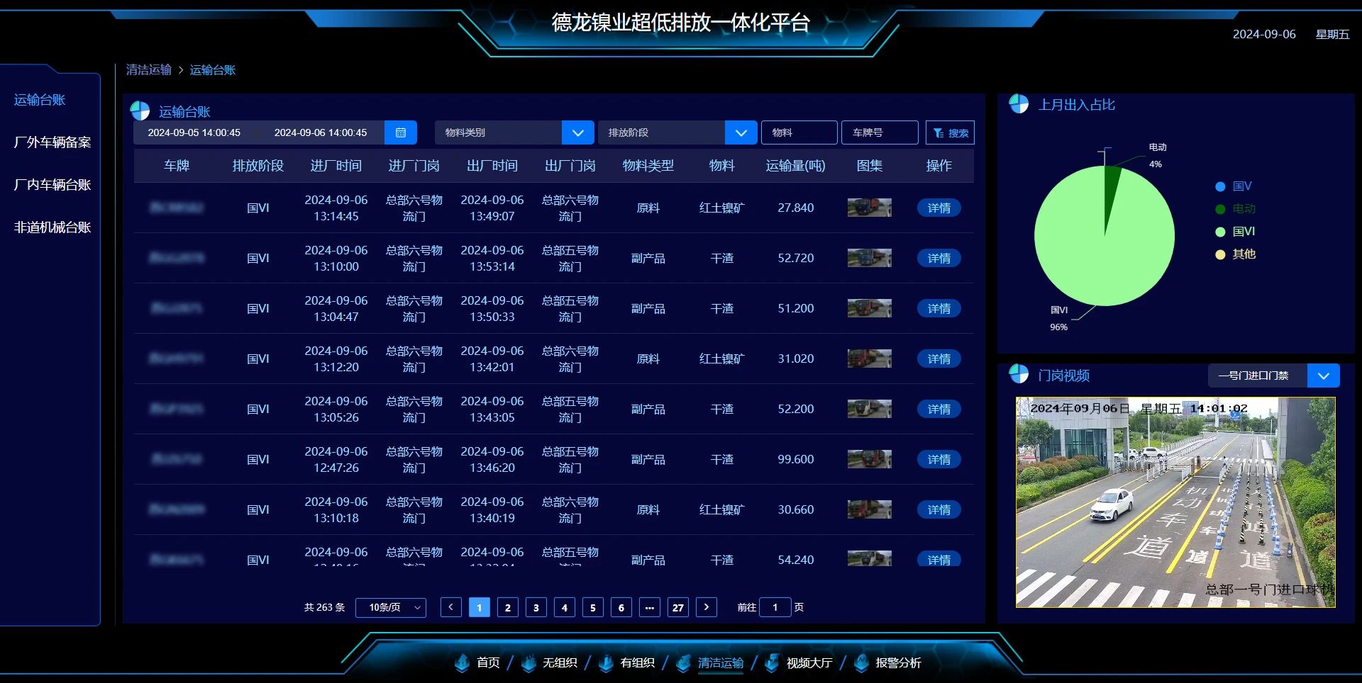 根據(jù)環(huán)保文件要求,九九在料棚出車門新建了8臺智能封閉洗車機(jī)。同時將清潔運輸系統(tǒng)數(shù)據(jù)接入及展示在超低排放環(huán)保集中管控平臺,根據(jù)超低排放政策的要求,統(tǒng)計車輛進(jìn)出廠數(shù)據(jù),物料進(jìn)出廠信息(大宗物料)數(shù)據(jù)、物資計量稱重數(shù)據(jù)、產(chǎn)品運輸基礎(chǔ)臺賬數(shù)據(jù)等各類數(shù)據(jù)。清潔運輸各類數(shù)據(jù)上傳至管控一體化平臺2023年10月,冶金規(guī)劃研究院對德龍鎳業(yè)7月-9月清潔方式運輸情況進(jìn)行現(xiàn)場核查評估,依據(jù)近三個月進(jìn)出廠大宗物料和產(chǎn)品運輸臺賬核算了每個月清潔運輸比例,現(xiàn)場核查了每一種物料和產(chǎn)品運輸方式,抽查了部分廠內(nèi)運輸車輛和非道路移動機(jī)械臺賬記錄一致性和準(zhǔn)確性。統(tǒng)計分析了2023年7月-9月三個月運輸臺賬,收集了三個月進(jìn)出廠大宗物料及產(chǎn)品的汽車運輸過磅磅單,并與運輸臺賬核驗。通過機(jī)動車環(huán)保網(wǎng)、重型柴油車排放階段查詢平臺查詢進(jìn)出廠大宗物料及產(chǎn)品汽車運輸車輛廠內(nèi)運輸車輛和跨區(qū)倒運車輛的排放標(biāo)準(zhǔn)的準(zhǔn)確性,驗證了非道路移動機(jī)械編碼登記情況及臺賬記錄信息準(zhǔn)確性。