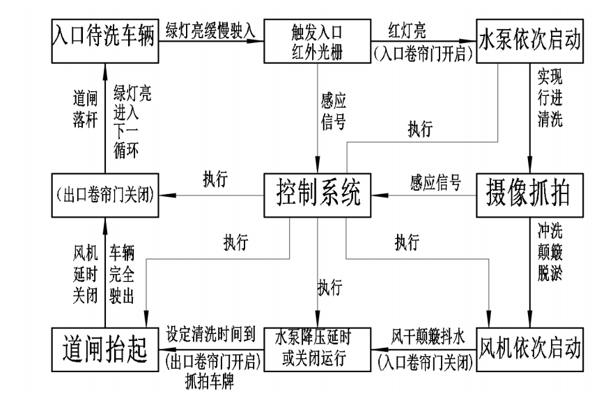 通過式洗車,車輛緩慢靠近洗車平臺,紅外光柵感應,車輛緩慢駛?cè)霙_洗顛簸抖塵區(qū),水泵自動啟動沖洗車輛+顛簸脫淤抖塵,車輛駛?cè)腼L機吹干顛簸抖水區(qū),風機自動啟動吹干車輛+顛簸抖水,防砸道閘自動抬桿,車輛緩慢駛出洗車機。洗車系統(tǒng)由側(cè)面沖洗和底部沖洗,風機吹干和顛簸脫淤抖塵抖水系統(tǒng)組成。