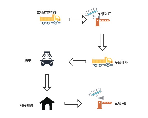 當(dāng)車輛進廠時,系統(tǒng)可自動識別判定車輛是否有進廠作業(yè)任務(wù),排放階段是否達到環(huán)保要求。出廠時,系統(tǒng)自動識別判定是否有洗車、是否有過磅、排放階段是否達標(biāo),可對接政府環(huán)保平臺,施行重污染天氣管控策略。