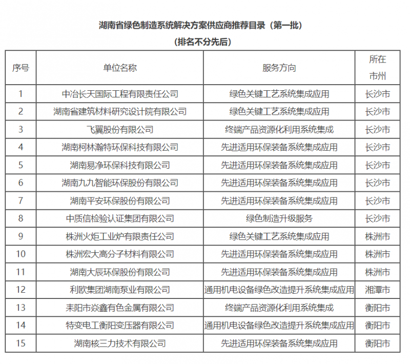 近日,湖南省工業(yè)和信息化廳發(fā)布《湖南省綠色制造系統(tǒng)解決方案供應(yīng)商推薦目錄(第一批)》,全省共有15家企業(yè)入選,其中湖南九九智能環(huán)保股份有限公司與其他7家長沙企業(yè)登榜。