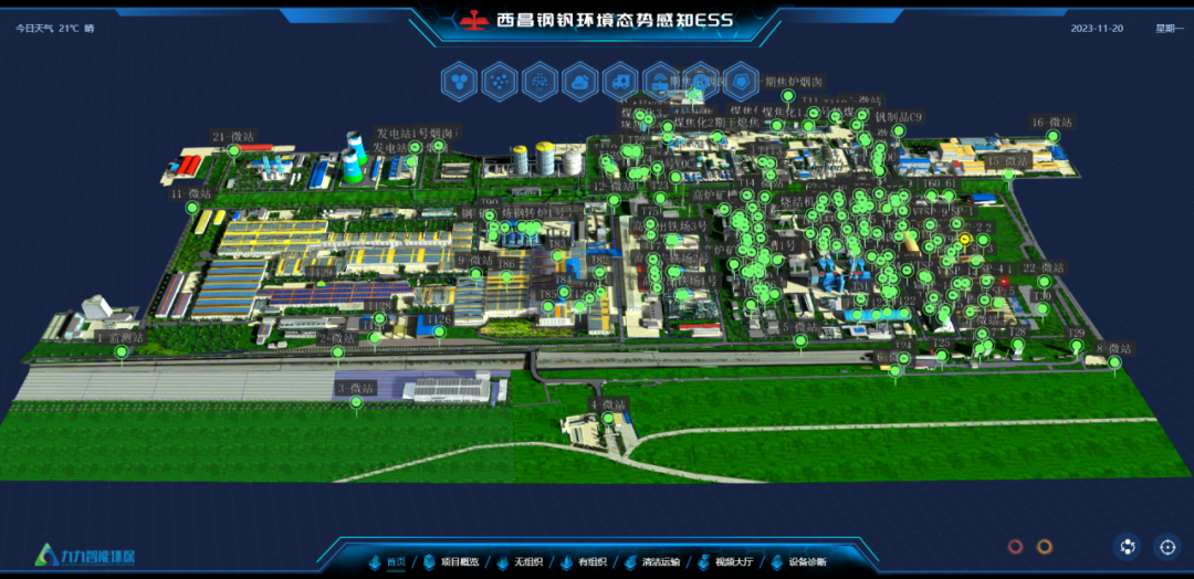 由九九智能環(huán)保承建的西昌鋼釩環(huán)境態(tài)勢感知ESP系統(tǒng)建設項目,通過建設超低排放管控治一體化平臺,實現(xiàn)了西昌鋼釩公司有組織排放、無組織排放、廠區(qū)空氣質(zhì)量以及清潔運輸系統(tǒng)等集中管控,滿足超低排放對無組織集中控制系統(tǒng)的評估監(jiān)測要求,為全面提升西昌鋼釩無組織排放無人化、智能化、系統(tǒng)化管控建立了基礎。