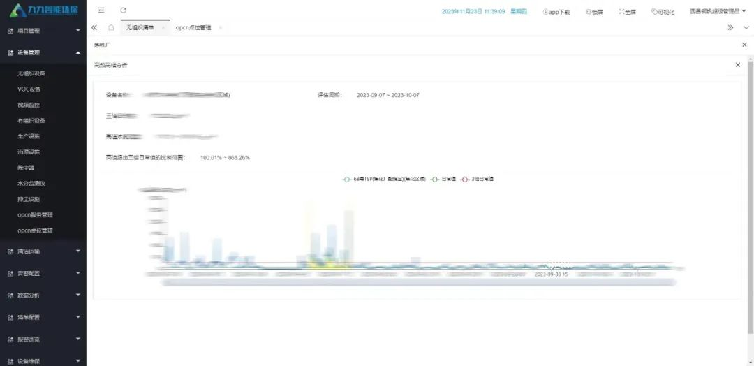 在無組織排放源治理環(huán)節(jié),九九智能環(huán)保通過空氣質(zhì)量監(jiān)測微站、TSP監(jiān)測儀、VOCs在線監(jiān)測設備、視覺化TSP及智能噴霧機、雙流體設備等構建無組織監(jiān)測治理方案。此套設備接入無組織排放治理集中管控一體化平臺,運用物聯(lián)網(wǎng)、大數(shù)據(jù)、機器學習等技術手段實現(xiàn)了對廠內(nèi)所有無組織排放源以及廠區(qū)空氣質(zhì)量進行實時無死角集中監(jiān)測、管控,實現(xiàn)對無組織排放的智能化自動管控和治理。