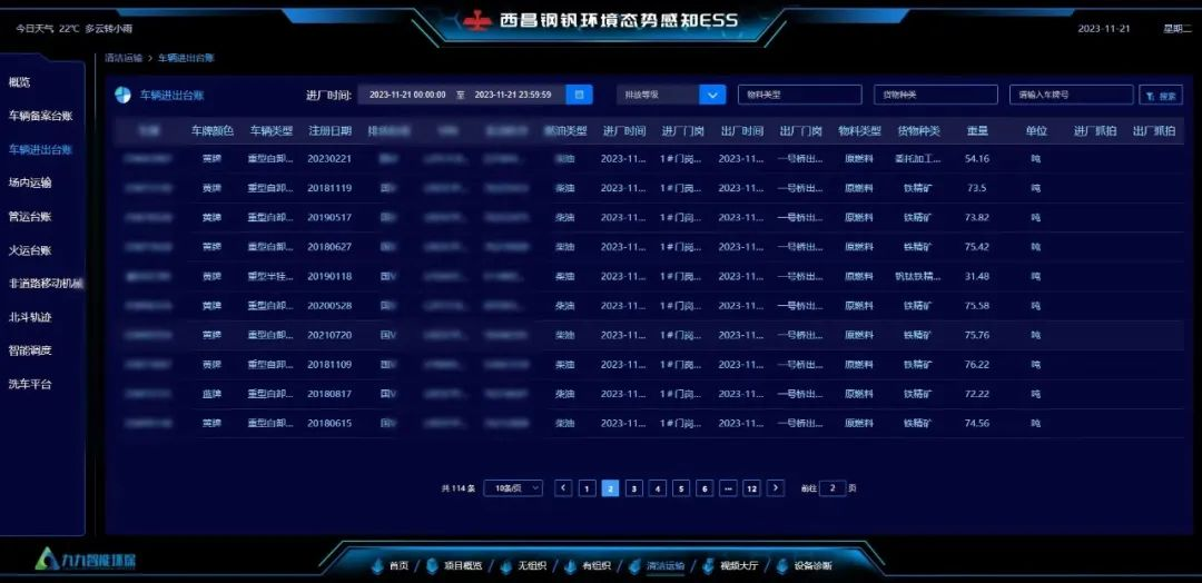 清潔運輸方面,廠區(qū)清潔運輸門禁系統(tǒng)相關數(shù)據(jù)接入無組織排放管控治一體化平臺。在運輸車輛進出時,環(huán)保平臺能獲取車輛進出廠時間、抓拍圖片、車輛排放等級等信息。同時對接智慧物流系統(tǒng),實時上傳車輛運輸各類信息,建立清潔運輸臺賬。