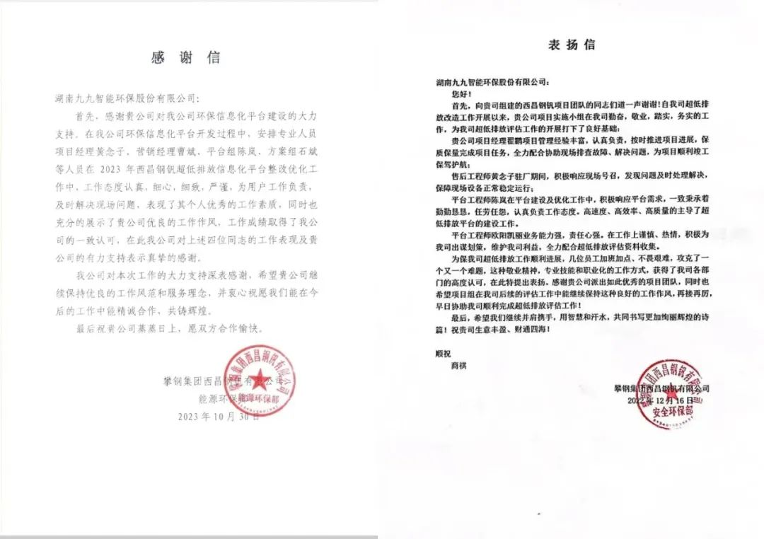 項目建設過程中,九九智能環(huán)保項目組以其專業(yè)品質(zhì)和高效服務,獲得業(yè)主單位西昌鋼釩發(fā)來的表揚信,對九九智能環(huán)保項目團隊優(yōu)質(zhì)履約能力給予了高度肯定!