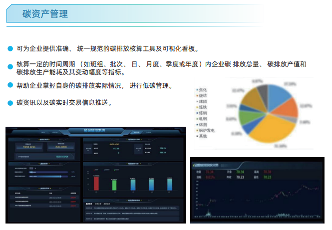 “碳資產(chǎn)管理”模塊提供標(biāo)準(zhǔn)化核算工具,自動計(jì)算不同周期內(nèi)的碳排放總量、碳強(qiáng)度等關(guān)鍵指標(biāo),并可視化呈現(xiàn)。同時,推送實(shí)時碳市場資訊與交易信息,助力決策。