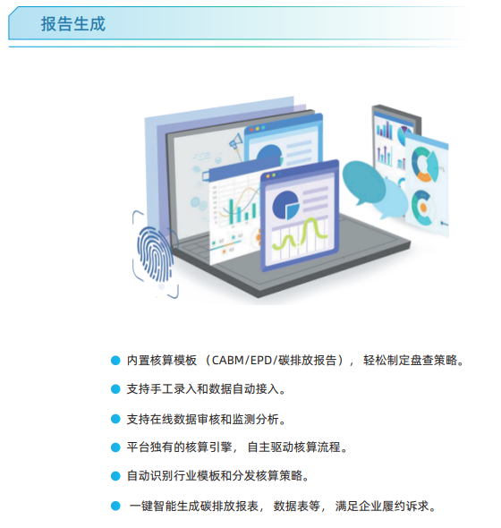 “報(bào)告生成”功能內(nèi)置各類標(biāo)準(zhǔn)模板,支持?jǐn)?shù)據(jù)自動采集與審核,利用智能核算引擎,能一鍵生成滿足政府履約、產(chǎn)品認(rèn)證等多種需求的合規(guī)報(bào)告,極大提升效率與準(zhǔn)確性。