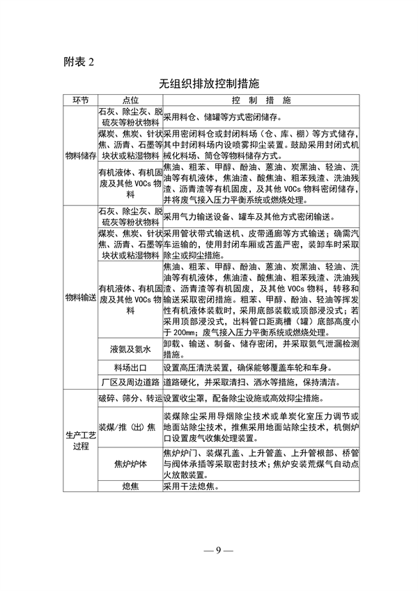 (二)無組織排放改造。物料儲(chǔ)存、物料輸送、生產(chǎn)工藝過程、敞開液面等無組織排放源,在保障安全生產(chǎn)的前提下,采用密閉、封閉等有效治理措施。產(chǎn)塵點(diǎn)按照“應(yīng)收盡收”原則合理配置廢氣收集設(shè)施,優(yōu)化收集風(fēng)量。石灰、除塵灰、脫硫灰等粉狀物料采用料倉、儲(chǔ)罐等方式密閉儲(chǔ)存,采用氣力輸送設(shè)備、罐車及其他方式密閉輸送。煤炭、焦炭、針狀焦等塊狀或粘濕物料采用密閉料倉或封閉料場(chǎng)(倉、庫、棚)等方式儲(chǔ)存,鼓勵(lì)采用封閉式機(jī)械化料場(chǎng)、筒倉等儲(chǔ)存方式,采用管狀帶式輸送機(jī)、皮帶通廊等方式輸送。有機(jī)液體、有機(jī)固廢及其他VOCs物料應(yīng)密閉儲(chǔ)存,轉(zhuǎn)移和輸送應(yīng)采取密閉措施,并將廢氣接入壓力平衡系統(tǒng)或燃燒處理;揮發(fā)性有機(jī)液體裝車采用底部裝載或頂部浸沒式。液氨及氨水卸載、輸送、制備、儲(chǔ)存密閉,并采取氨氣泄漏檢測(cè)措施。焦?fàn)t爐門、裝煤孔蓋、上升管蓋、上升管根部、橋管與閥體承插等采用密封技術(shù);焦?fàn)t安裝荒煤氣自動(dòng)點(diǎn)火放散裝置。煤氣凈化、化學(xué)產(chǎn)品深加工等區(qū)域安裝煤氣點(diǎn)火放散裝置,放散煤氣及時(shí)點(diǎn)燃并充分燃燒。生產(chǎn)廢水集輸應(yīng)采用密閉管道輸送,生產(chǎn)廢水預(yù)處理設(shè)施及厭氧池、預(yù)曝氣池應(yīng)加蓋并配備廢氣收集處理設(shè)施,采用高效(組合)工藝處理。無組織排放控制設(shè)施與生產(chǎn)設(shè)施同步正常運(yùn)行,產(chǎn)塵點(diǎn)及生產(chǎn)設(shè)施無可見煙粉塵外逸,廠區(qū)整潔無積塵、無明顯異味。具體要求見附表2。