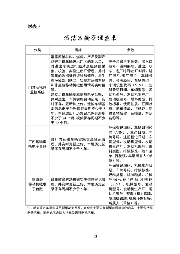 (三)清潔運(yùn)輸改造。煤炭、焦炭等大宗物料和產(chǎn)品中長(zhǎng)距離運(yùn)輸優(yōu)先采用鐵路或水路,短途接駁和廠內(nèi)物料轉(zhuǎn)運(yùn)優(yōu)先采用管狀帶式輸送機(jī)或皮帶通廊。進(jìn)出廠區(qū)物料和產(chǎn)品采用鐵路、水路、管道、管狀帶式輸送機(jī)、封閉皮帶通廊等清潔方式運(yùn)輸比例不低于80%,清潔運(yùn)輸比例達(dá)不到80%的部分采用新能源汽車替代(2025年底前新能源汽車替代比例不低于60%),其他運(yùn)輸部分全部采用新能源或國(guó)六排放標(biāo)準(zhǔn)車輛。廠區(qū)內(nèi)運(yùn)輸采用新能源車輛(2025年底前可采用國(guó)六排放標(biāo)準(zhǔn)的汽車)。非道路移動(dòng)機(jī)械原則上采用新能源,無對(duì)應(yīng)產(chǎn)品的滿足國(guó)四及以上排放標(biāo)準(zhǔn)(2025年底前可采用國(guó)三排放標(biāo)準(zhǔn)非道路移動(dòng)機(jī)械)。?;愤\(yùn)輸?shù)忍胤N車輛可采用國(guó)五及以上排放標(biāo)準(zhǔn)汽車(燃?xì)廛囕v達(dá)到國(guó)六排放標(biāo)準(zhǔn))。優(yōu)化廠內(nèi)總圖布置,合理規(guī)劃物料輸送路線,減少廠內(nèi)物料二次倒運(yùn)和汽車運(yùn)輸量。