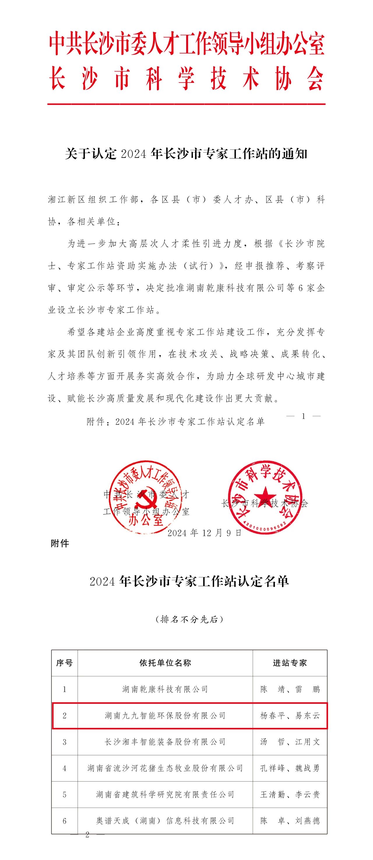 2024年長(zhǎng)沙市專家工作站名單公布!九九智能環(huán)保入選!