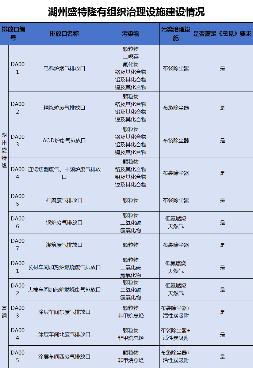 通過(guò)超低排放改造,湖州盛特隆對(duì)于公司各有組織排放源配套了各種污染治理設(shè)施:電爐煙氣采用第四孔爐內(nèi)排煙+密閉罩+屋頂罩+袋式除塵器的治理技術(shù),其余點(diǎn)位均采用袋式除塵;除此之外,涂層車間噴粉過(guò)程中產(chǎn)生少量有機(jī)廢氣采用活性炭吸附法工藝,符合“意見(jiàn)”中對(duì)有組織廢氣治理的技術(shù)要求。