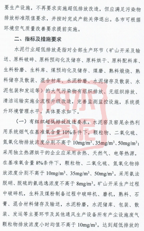 水泥行業(yè)超低排放是指對全部生產(chǎn)環(huán)節(jié)(礦山開采及輸送、原料破碎、原料預均化及儲存、原料烘干、原料配料庫、生料粉磨、生料庫、煤預均化及儲存、煤磨、熟料煅燒、熟料儲存及散裝、混合材庫、水泥粉磨、水泥儲存及散裝、水泥包裝和發(fā)運等)的大氣污染物有組織排放、無組織排放、清潔運輸實施全流程升級改造,完善監(jiān)測監(jiān)控設施,系統(tǒng)提升環(huán)境管理水平。具體要求如下: