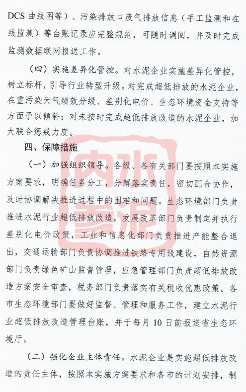 對完成超低排放的水泥企業(yè),在重污染天氣績效分級、差別化電價、生態(tài)環(huán)境資金支持等方面予以傾斜;對未按時完成超低排放改造的水泥企業(yè),加大聯(lián)合懲戒力度。