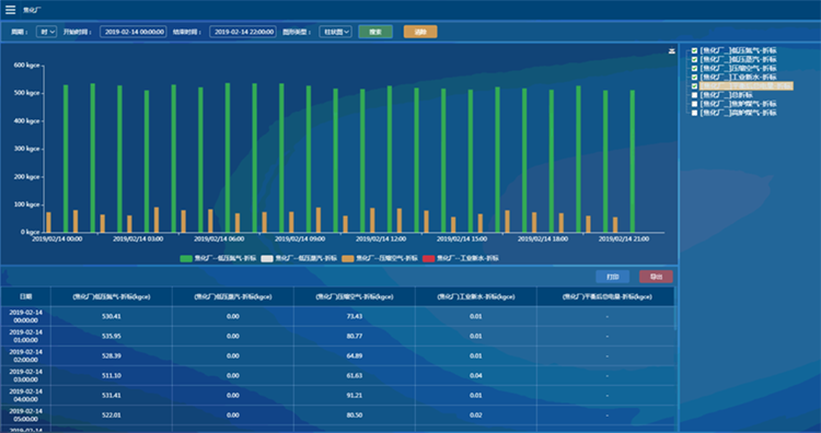 統(tǒng)計與分析:對電能、氣、水、汽等各種能源介質(zhì)的實時計量數(shù)據(jù)按工序、類別給出各個能源介質(zhì)的每日或月的輸入量/消耗量/發(fā)生量/回收量的統(tǒng)計信息并形成日報或月報。了解不同對象的能耗規(guī)律,自動對這些對象進行能耗排名,找出能源使用過程中的漏洞和不合理地方,從而調(diào)整能源分配策略,減少能源使用過程中的浪費。