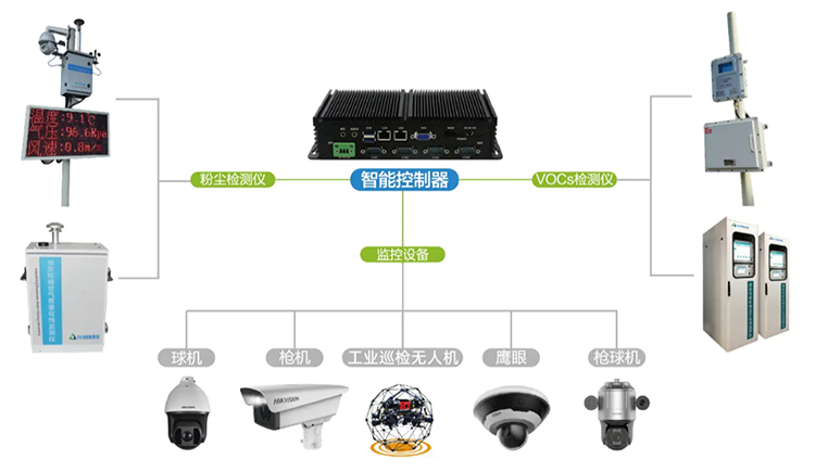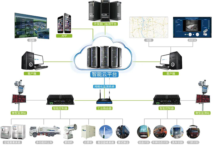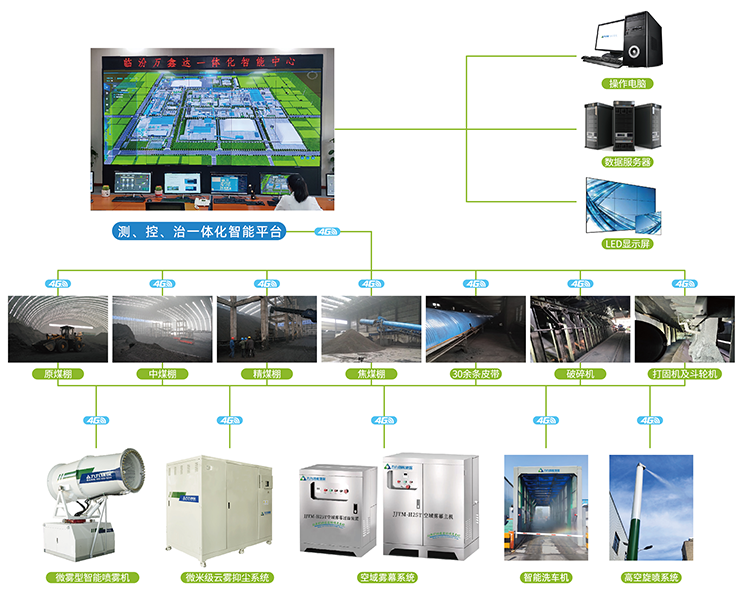 基于分散式控制與集中式?jīng)Q策的智能聯(lián)動技術(shù),結(jié)合第三代智能霧炮、智能洗車機(jī)、云霧(干霧)抑塵系統(tǒng)、空域霧幕(天霧)系統(tǒng)、高空旋噴(霧樁)系統(tǒng)、袋式除塵裝置、VOCs治理裝置等智能裝備,對平臺下達(dá)的實(shí)時(shí)指令迅速反應(yīng)、精準(zhǔn)治理。