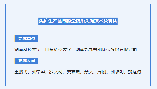 該項目由湖南科技大學、山東科技大學、湖南九九智能股份有限公司共同完成。項目授權發(fā)明專利10項,出版專著2部,發(fā)表學術論文60余篇,研究成果已廣泛應用于湖南、貴州、山東等多個省份煤炭企業(yè),有效降低了煤礦生產(chǎn)區(qū)域的粉塵濃度,推動了煤礦安全科技進步,經(jīng)濟與社會效益顯著,對我國科學采礦、綠色礦山建設具有積極意義。