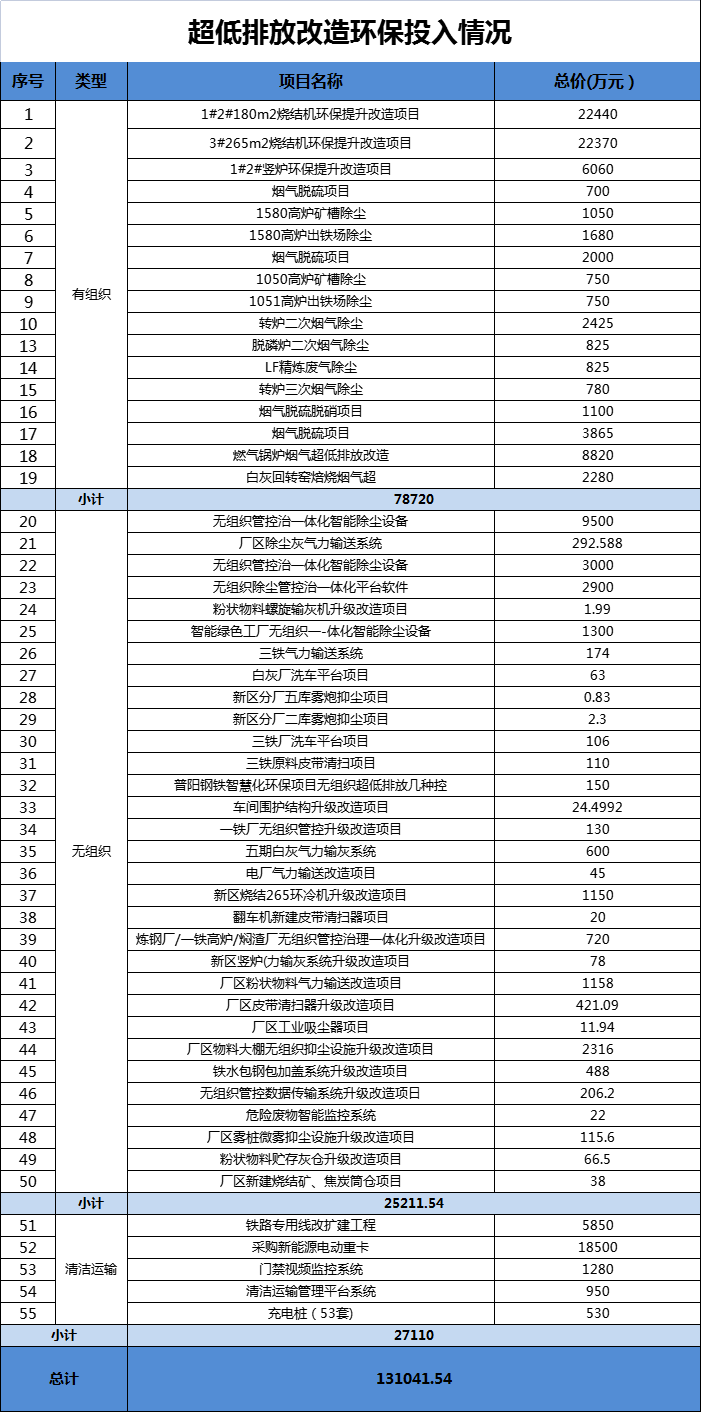 普陽鋼鐵共投入近20億元環(huán)保治理資金累計實施燒結(jié)機脫硫、脫硝、除塵、豎爐脫硫脫硝、脫白、白灰窯脫硫脫硝除塵、煉鐵除塵、軋鋼加熱爐脫硫脫硝、封閉料場、超低排放集中控制系統(tǒng)等100余項環(huán)保提升治理項目,其中包括:有組織排放改造投入約7.87億元,無組織排放改造投入約2.52億元,清潔運輸改造約2.71億元,其他投入約6.9億元等。