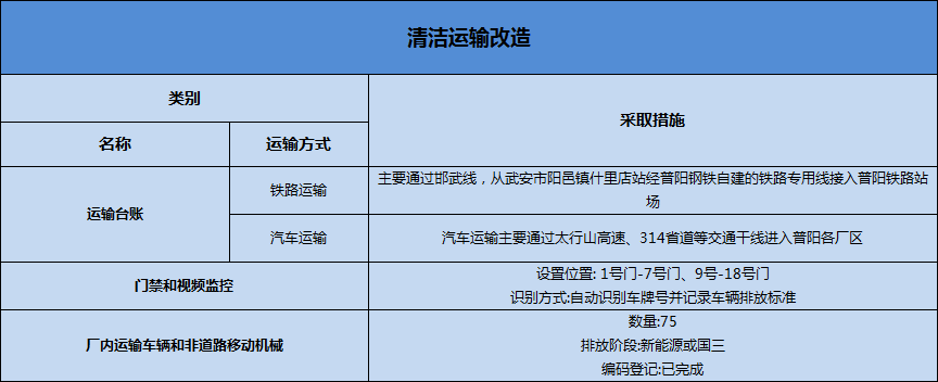 普陽鋼鐵為達(dá)到超低排放要求,開展了清潔運輸全面改造工程,主要包括:鐵路專用線改擴建工程、采購新能源電動重卡、門禁視頻監(jiān)控系統(tǒng)、清潔運輸管理平臺系統(tǒng)、充電樁等,于2022年6月全部整改完畢。