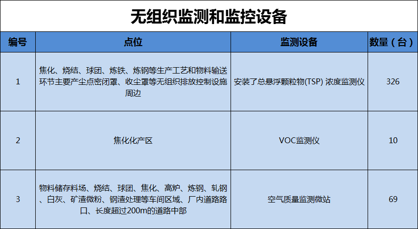 安豐鋼鐵分別安裝了326臺(tái)總懸浮顆粒物(TSP)濃度監(jiān)測(cè)儀,10臺(tái)VOC監(jiān)測(cè)儀,69臺(tái)空氣微站,實(shí)時(shí)監(jiān)測(cè)廠區(qū)的無(wú)組織排放情況,以便及時(shí)治理。