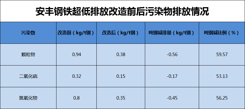 通過(guò)超低排放改造,安豐鋼鐵噸鋼污染物排放量明顯下降,顆粒物、二氧化硫和氮氧化物噸鋼污染物排放量分別下降了59.57%、53.13%和56.25%,超低改造以來(lái)在全廠重點(diǎn)廢氣排放除塵及脫硫脫硝方面取得了顯著成效。