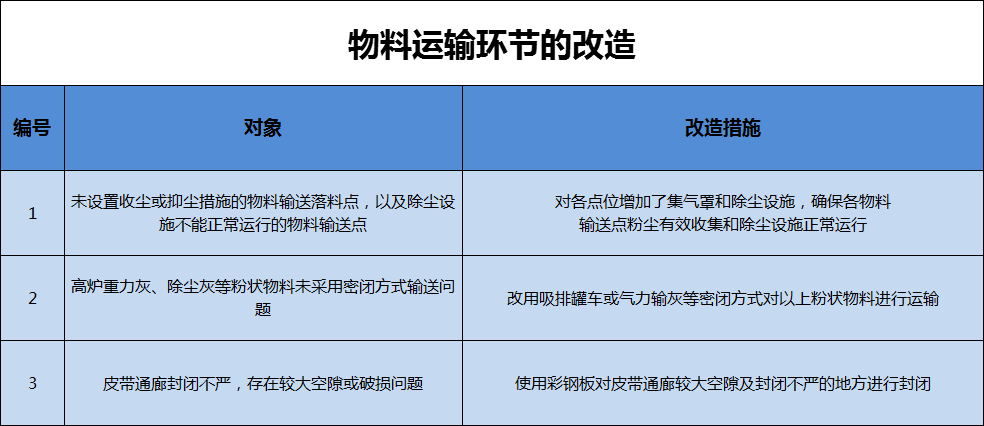 在物料輸送方面,安豐鋼鐵針對(duì)物料輸送無(wú)組織排放源存在問(wèn)題也進(jìn)行了整改,整改詳情如下: