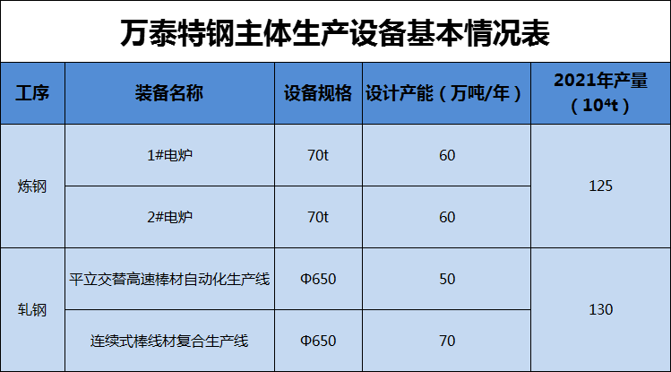 萬泰特鋼目前擁有2座70噸電弧爐,設(shè)計(jì)產(chǎn)能60萬噸/a。主要生產(chǎn)設(shè)施及產(chǎn)量情況見下表。
