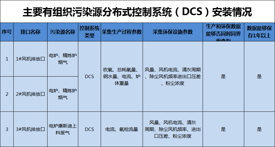 金虹鋼鐵主要排放口治理情況為:電爐采用爐內(nèi)排煙+密閉罩+屋頂罩+袋式除塵器治理工藝,軋鋼加熱爐配置了SCR脫硝工藝,并對不滿足要求的點(diǎn)位逐一進(jìn)行了整改。