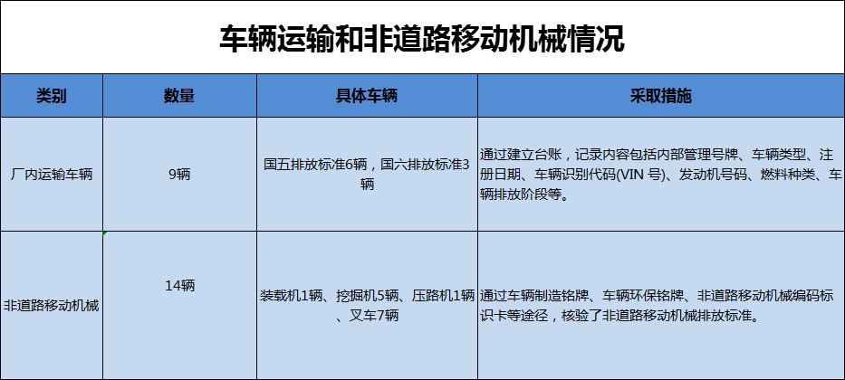廠內(nèi)運(yùn)輸車輛:廠內(nèi)運(yùn)輸車輛9輛(國五排放標(biāo)準(zhǔn)6輛,國六排放標(biāo)準(zhǔn)3輛),通過建立臺賬,記錄內(nèi)容包括內(nèi)部管理號牌、車輛類型、注冊日期、車輛識別代碼(VIN號)、發(fā)動(dòng)機(jī)號碼、燃料種類、車輛排放階段等。