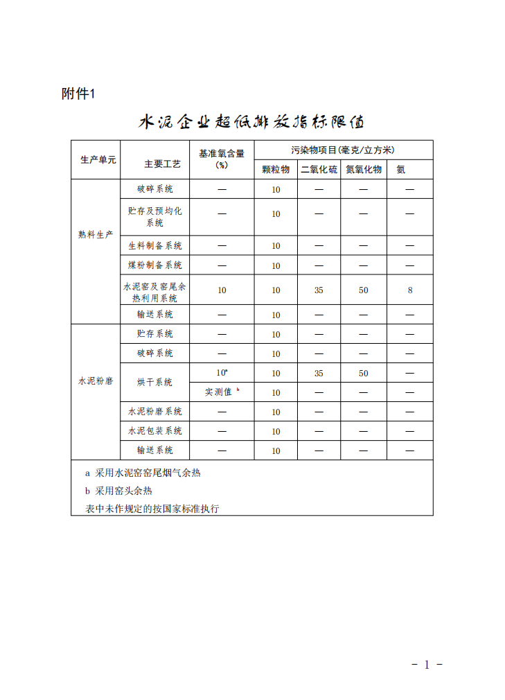 (一)有組織排放控制指標(biāo)。在基準(zhǔn)氧含量10%的條件下,水泥窯及窯尾余熱利用系統(tǒng)煙氣顆粒物、二氧化硫、氮氧化物排放濃度小時均值分別不高于10、35、50mg/m3,氨排放濃度小時均值不高于8mg/m3(其他有組織排放指標(biāo)詳見附件1)。脫硝氨水消耗量小于4kg/t熟料(基于20%的氨水濃度折算)。達(dá)到超低排放的水泥企業(yè)每月至少95%以上時段小時均值排放濃度滿足上述要求。
