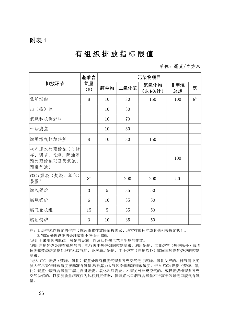 要求在基準(zhǔn)含氧量8%的條件下,焦?fàn)t煙囪廢氣顆粒物、二氧化硫、氮氧化物、非甲烷總烴、氨排放濃度小時(shí)均值分別不高于10mg/m3、30mg/m3、150mg/m3、100mg/m3、8mg/m3;生產(chǎn)廢水處理設(shè)施非甲烷總烴濃度小時(shí)均值不高于100mg/m3。其他污染源顆粒物排放濃度小時(shí)均值不高于10mg/m3。