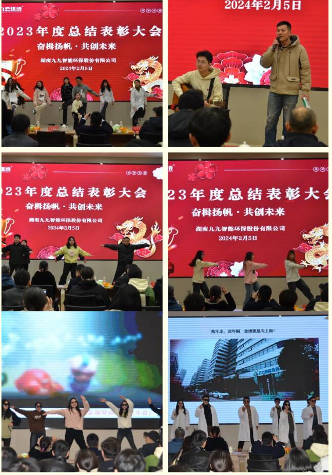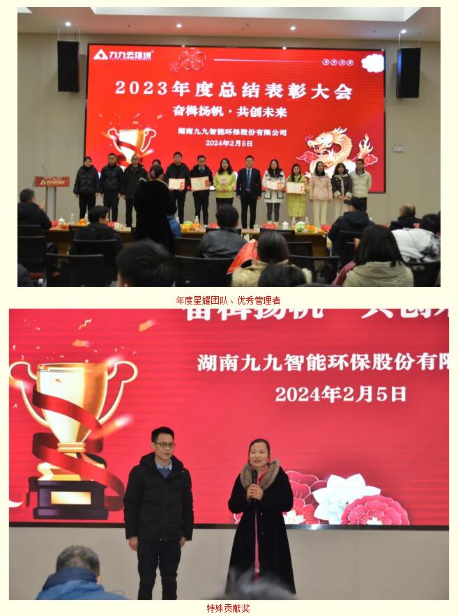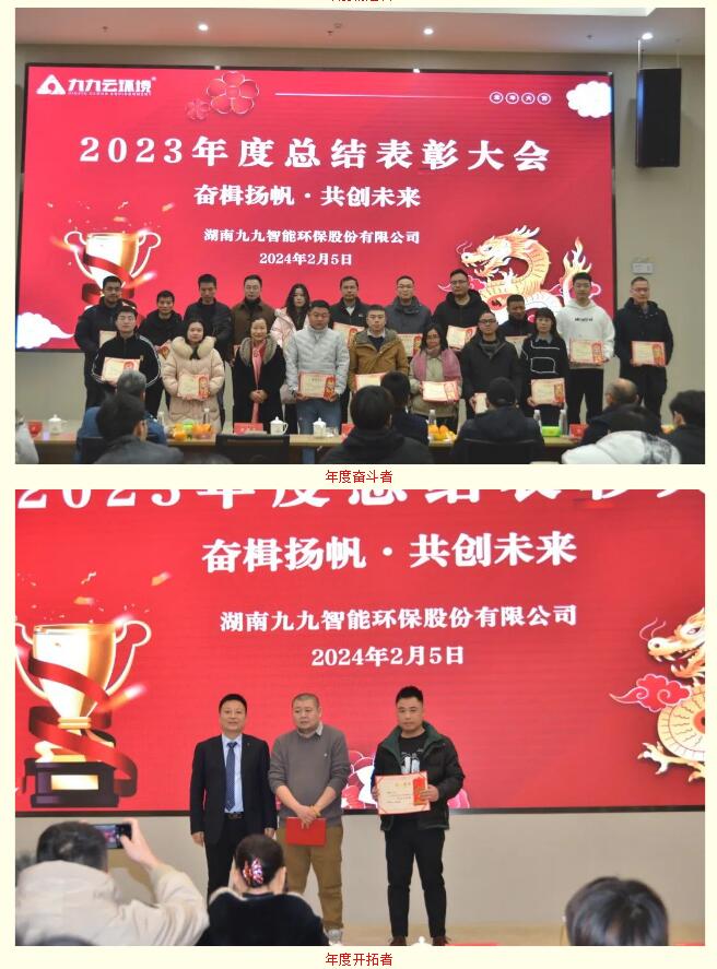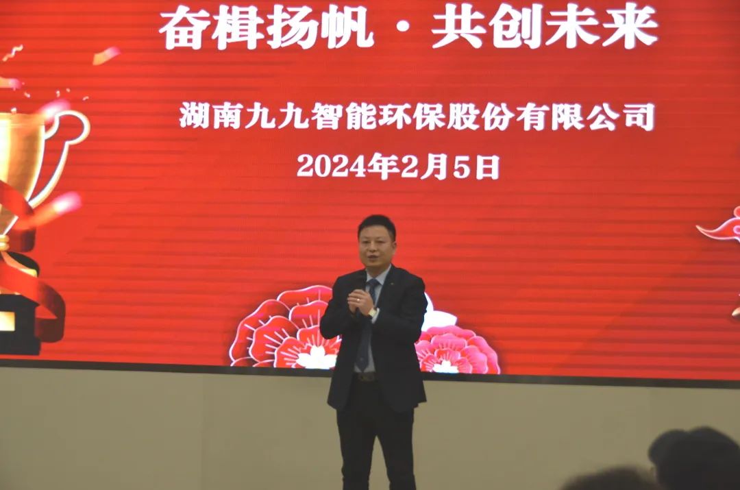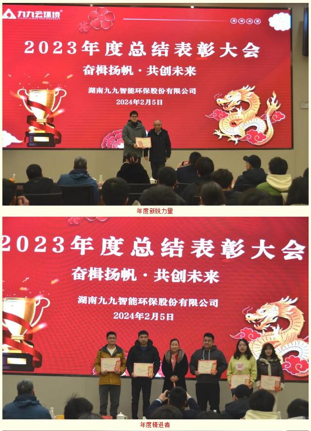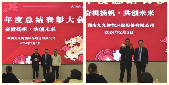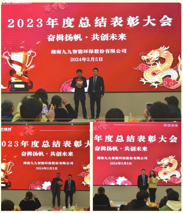 2024年2月5日,九九智能環(huán)保以“奮楫揚帆,共創(chuàng)未來”為主題的2023年總結表彰大會隆重舉行,對過去一年為公司發(fā)展做出重要貢獻的優(yōu)秀員工予以表彰,同時對2024年工作作出展望和重要部署。九九總部及子公司全體員工歡聚一堂,部分依然奮戰(zhàn)在項目一線的員工通過直播共同見證了這美好的時刻。