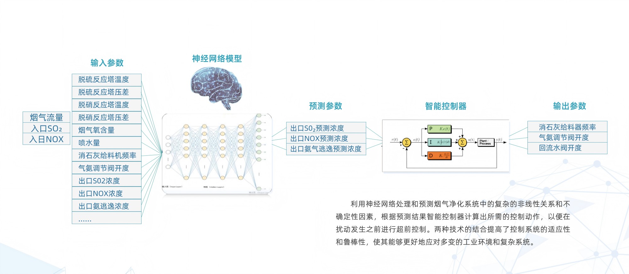 在利用神經(jīng)網(wǎng)絡(luò)處理和預(yù)測煙氣凈化系統(tǒng)中的復(fù)雜的非線性關(guān)系和不確定性因素,根據(jù)預(yù)測結(jié)果智能控制器計算出所需的控制動作,以便在擾動發(fā)生之前進(jìn)行超前控制。兩種技術(shù)的結(jié)合提高了控制系統(tǒng)的適應(yīng)性和魯棒性,使其能夠更好地應(yīng)對多變的工業(yè)環(huán)境和復(fù)雜系統(tǒng)。