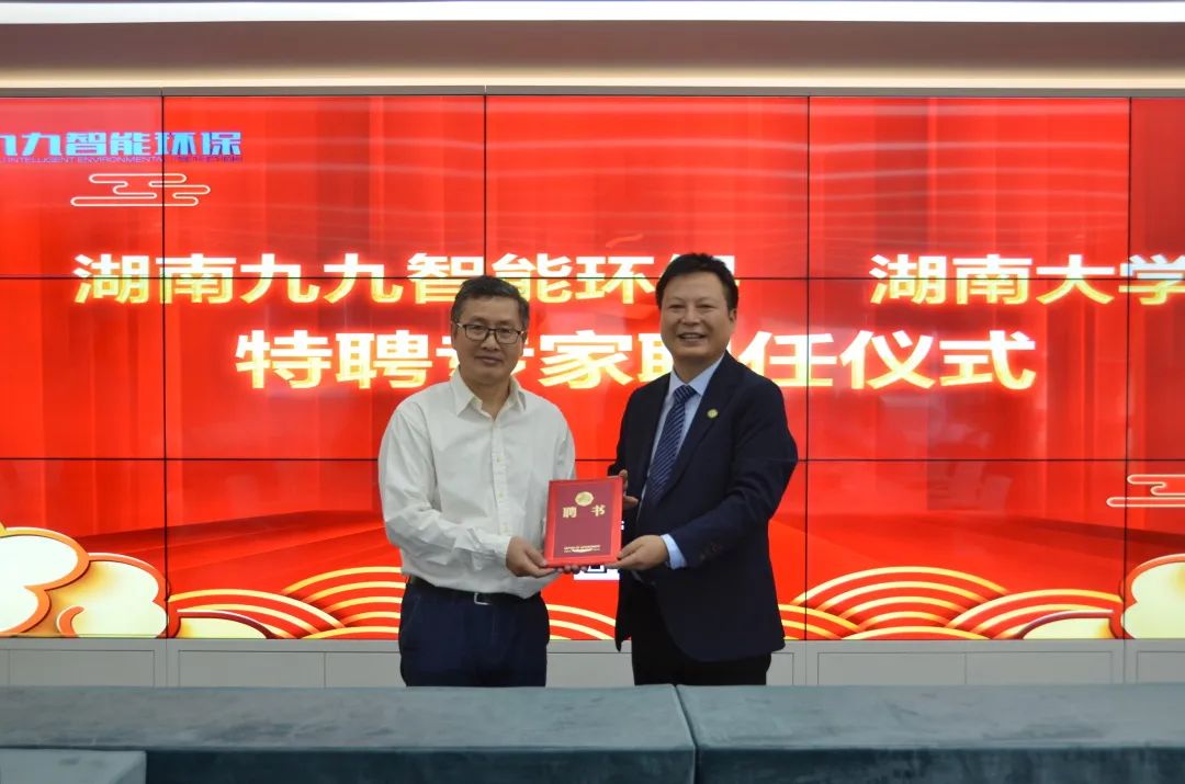簽約儀式上,湖南大學楊春平教授與九九智能環(huán)保董事長劉黎明代表雙方簽署了校企協(xié)同創(chuàng)新合作協(xié)議,董事長劉黎明作為公司代表向湖南大學楊春平教授、林燕博士頒發(fā)了特聘專家聘任書。雙方在環(huán)境污染防治領(lǐng)域正式開啟合作。