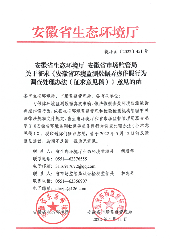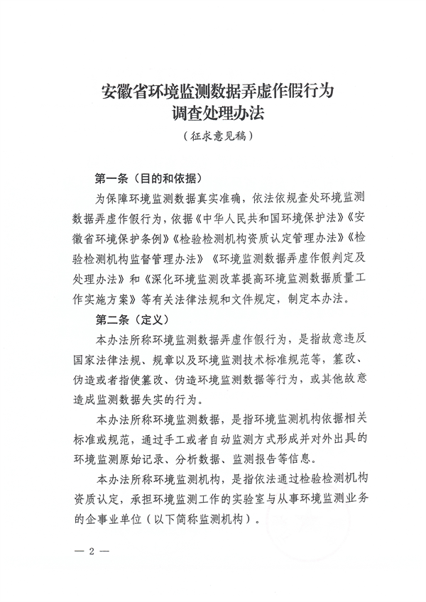 省生態(tài)環(huán)境廳、安徽省市場監(jiān)管局發(fā)布《安徽省環(huán)境監(jiān)測數(shù)據(jù)弄虛作假行為調(diào)查處理辦法(征求意見稿)》,以保障環(huán)境監(jiān)測數(shù)據(jù)真實準確,依法依規(guī)查處環(huán)境監(jiān)測數(shù)據(jù)弄虛作假行為,適用于在安徽省開展環(huán)境監(jiān)測活動的監(jiān)測機構(gòu)監(jiān)測數(shù)據(jù)弄虛作假行為的調(diào)查和處理。詳情如下: