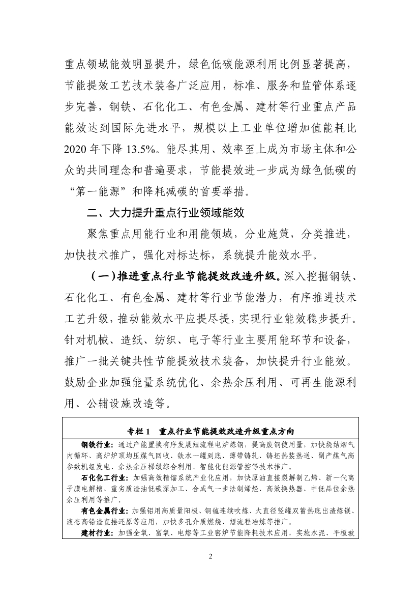 計劃提出:到2025年,重點(diǎn)工業(yè)行業(yè)能效全面提升,數(shù)據(jù)中心等重點(diǎn)領(lǐng)域能效明顯提升,綠色低碳能源利用比例顯著提高,節(jié)能提效工藝技術(shù)裝備廣泛應(yīng)用,標(biāo)準(zhǔn)、服務(wù)和監(jiān)管體系逐步完善,鋼鐵、石化化工、有色金屬、建材等行業(yè)重點(diǎn)產(chǎn)品能效達(dá)到國際先進(jìn)水平,規(guī)模以上工業(yè)單位增加值能耗比2020年下降13.5%。能盡其用、效率至上成為市場主體和公眾的共同理念和普遍要求,節(jié)能提效進(jìn)一步成為綠色低碳的“第一能源”和降耗減碳的首要舉措。