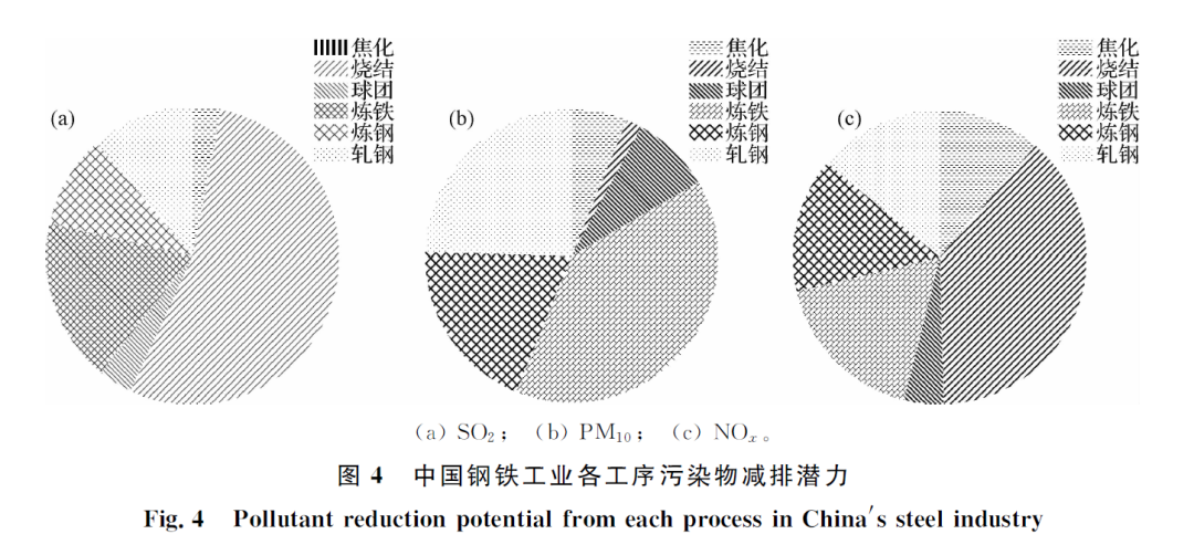 鋼鐵生產(chǎn)過程中污染排放最嚴(yán)重的兩個(gè)環(huán)節(jié)為燒結(jié)和焦化工序。李莎核算出中國某大型鋼鐵企業(yè)污染排放情況,指出該鋼鐵企業(yè)在2017年SO2和NOx有組織排放量最大的工序?yàn)闊Y(jié)工序,其次為焦化工序,該結(jié)果與GAO C等的研究一致。顆粒物排放主要包含主排放口、一般排放口和無組織排放,如圖2所示,鋼鐵企業(yè)顆粒物有組織主要排放口排放量最大的為燒結(jié)工序,其次為焦化工序;一般排放口顆粒物排放量最大的為煉鋼工序,其次為燒結(jié)工序和原料系統(tǒng);無組織顆粒物排放最大的為原料系統(tǒng),其次為燒結(jié)和煉鐵工序。湯鈴等的研究也表明,中國鋼鐵工業(yè)空氣污染物主要來源于燒結(jié)工序,燒結(jié)工序所排放的SO2、NOx、PM10和PM2.5分別占鋼廠總排放量的64.84%、78.72%、52.21%和56.40%(圖3)。因此,目前燒結(jié)、焦化、球團(tuán)和高爐煉鐵4個(gè)鐵前工序仍然是中國鋼鐵企業(yè)空氣污染物排放最嚴(yán)重的環(huán)節(jié),未來減少空氣污染物還是應(yīng)該從這4個(gè)鐵前工序入手。圖4所示為中國鋼鐵工業(yè)冶煉工序(不含原料系統(tǒng))減排潛力分析情況,可以看出SO2和NOx在燒結(jié)工序減排潛力最大,在不考慮原料系統(tǒng)的顆粒物排放的情況下,顆粒物在煉鐵工序減排潛力最大,這是因?yàn)橄鄬τ跓Y(jié)工序,對高爐煉鐵工序的無組織排放治理最差,高爐出鐵場和礦槽的顆粒物治理率不足42%,而燒結(jié)機(jī)頭和燒結(jié)機(jī)尾的顆粒物治理率均為99%以上。