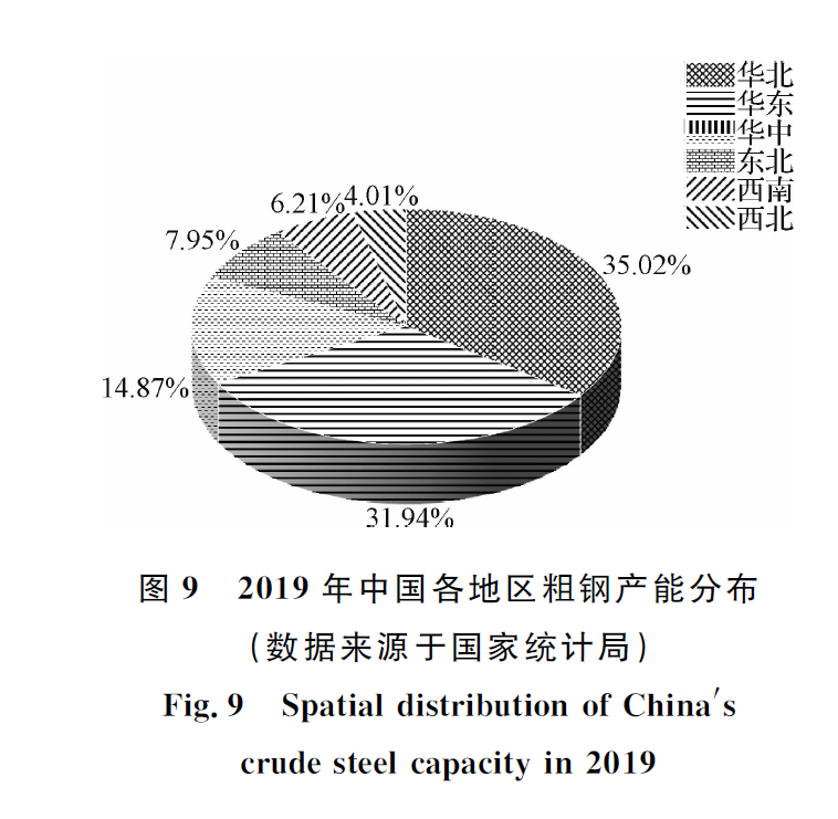 中國鋼鐵工業(yè)空氣污染物排放地域分布特點(diǎn)極其明顯,各地區(qū)鋼鐵工業(yè)空氣污染物排放差異顯著。中國鋼鐵工業(yè)空氣污染物排放量最大的區(qū)域是華北地區(qū)(京津冀),其次是華東地區(qū)(長三角)和華中地區(qū),分別排放SO2 572.52、531.11和276.45 kt,排放量所占比例如圖8所示。這是因?yàn)橹袊撹F產(chǎn)能主要集中在華北和華東地區(qū),2019年中國華北和華東地區(qū)的粗鋼產(chǎn)能所占比例分別為35.02%和31.94%(圖9),合計(jì)占中國總產(chǎn)能的67%左右。