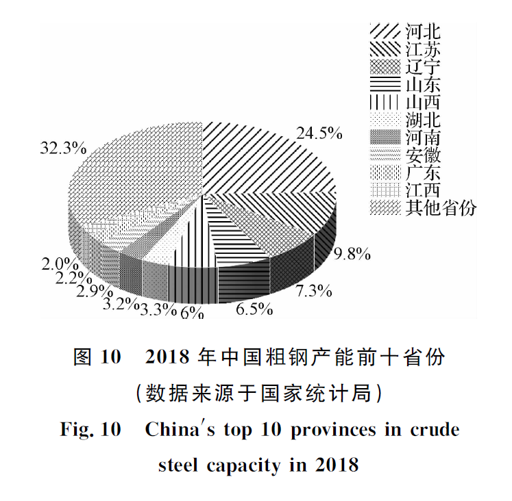 從中國各省份鋼鐵工業(yè)空氣污染物排放的統(tǒng)計(jì)結(jié)果來看,2012年中國鋼鐵工業(yè)SO2排放量前三的省份為河北、遼寧和江蘇,排放量所占比例分別為27.08%、10.04%和8.91%;NOx排放量前三的省份為河北、山東和江蘇,排放量占比分別為28.40%、9.00%和8.90%;PM2.5排放量前三的省份為河北、江蘇和遼寧,排放量所占比例分別為28.30%、9.11%和8.40%。據(jù)2018年數(shù)據(jù),中國鋼鐵工業(yè)SO2排放量靠前的三個(gè)省份依次為河北、遼寧和江蘇,排放量所占比例分別為17.69%、10.32%、10.17%;NOx排放量靠前的3個(gè)省份依然為河北、江蘇和山東,排放量所占比例分別為20.13%、11.34%、10.75%;PM10排放量靠前的3個(gè)省份依次為河北、江蘇和遼寧,排放量占比分別為18.94%、10.96%、9.33%。經(jīng)過多年的發(fā)展,主要空氣污染物排放省份并未發(fā)生變化,這主要與中國的鋼鐵產(chǎn)業(yè)分布有關(guān),河北、江蘇、山東和遼寧一直是中國鋼鐵產(chǎn)能最大的4個(gè)省份。這4個(gè)省份在2018年的粗鋼產(chǎn)能分別占中國總產(chǎn)能的24.5%、9.8%、7.3%和6.5%(圖10)。此外,從上述結(jié)果還可以發(fā)現(xiàn),從2012年到2018年中國第一產(chǎn)鋼大省河北省的鋼鐵工業(yè)空氣污染物排放大幅減小,這與河北省從2013年開始的去產(chǎn)能“6643”工程的成果息息相關(guān)。截止到2019年,河北省淘汰粗鋼產(chǎn)能共計(jì)11 941萬t。綜上分析,京津冀和長三角地區(qū)仍然是中國鋼鐵產(chǎn)業(yè)的主要區(qū)域,也是鋼鐵工業(yè)空氣污染物排放最嚴(yán)重的區(qū)域。